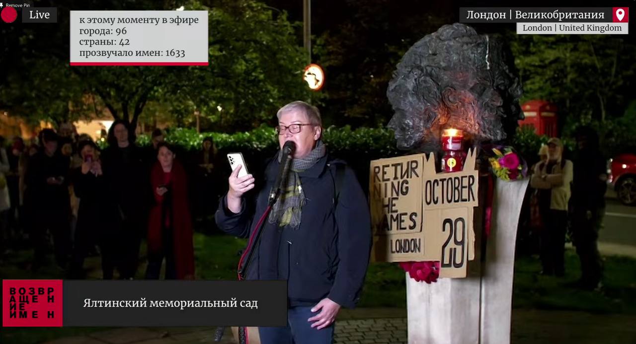 Screenshot of the 2024 broadcast of “Returning the names”. Since 2020, the event has been held online / “Возвращение имен” YouTube channel