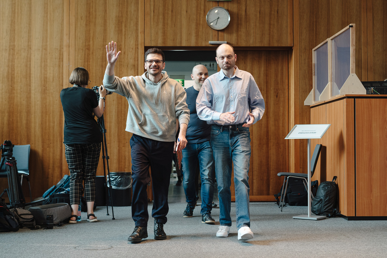 Ilya Yashin, Andrey Pivovarov and Vladimir Kara-Murza enter the press conference room of Deutsche Welle TV channel, their first public appearance after the exchange, 1 August 2024, Bonn, Germany / Photo: Dasha Trofimova for OVD-Info