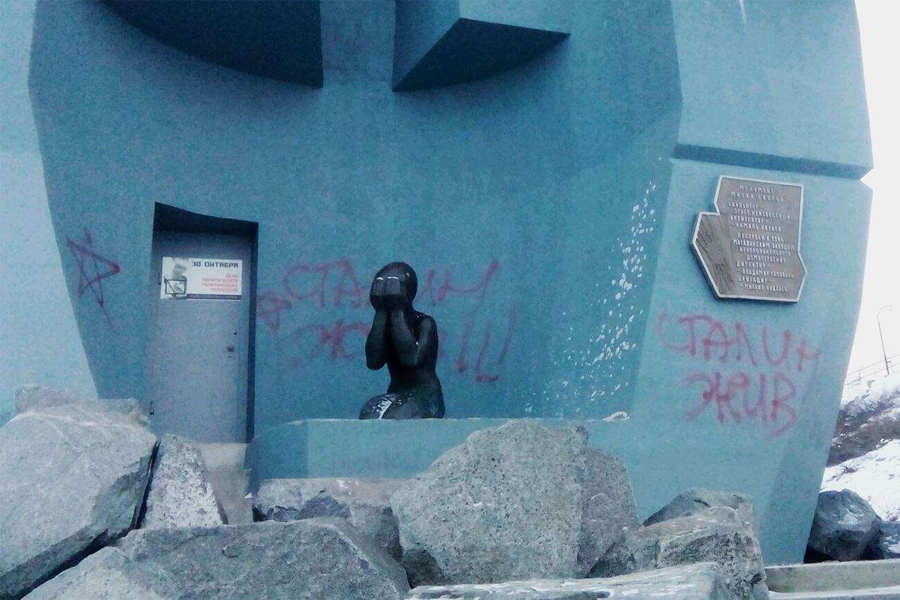 In 2016, the Mask of Sorrow monument in Magadan was vandalised with the words “Stalin Lives!” / Photo: @Kurnaeva_tanya, Twitter |