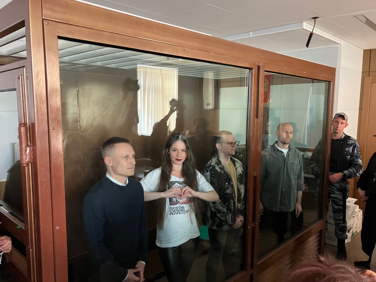 Konstantin Gabov, Antonina Favorskaya (wearing a “love is stronger than repression” shirt), Artem Kriger and Sergey Karelin in the Nagatinsky District Court, Moscow, 2 October 2024 / Photo: Mediazona |