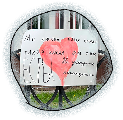 “We love our school like it is. Please don’t leave” poster in support of Elena Rakintseva, a school director who left a Perm school after refusing to implement “important conversations” — nationalistic propaganda lessons, 2023 / Photo: 366 Пермь |