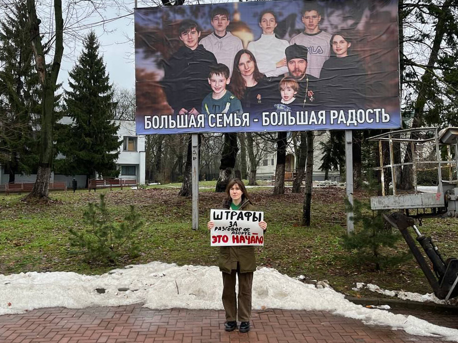 “Fines for talking about abortion is [just] the beginning” — Kaliningrad feminist protesting in front of the propaganda advert “Big Family — Big Joy”, 16 December 2023 / Photo: “Говорит НеМосква” Telegram channel |