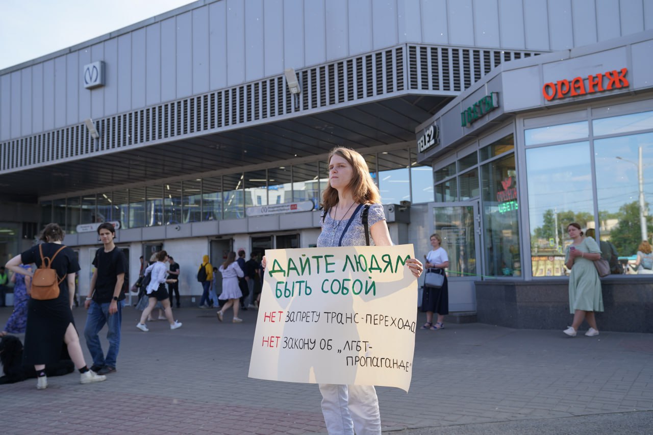 “Let people be themselves. No to the transition ban. No to the ‘LGBT propaganda’ law” — activist Elena Ioffe holds a protest sign in St. Petersburg, 16 June 2023 / Photo: RFE/RL |