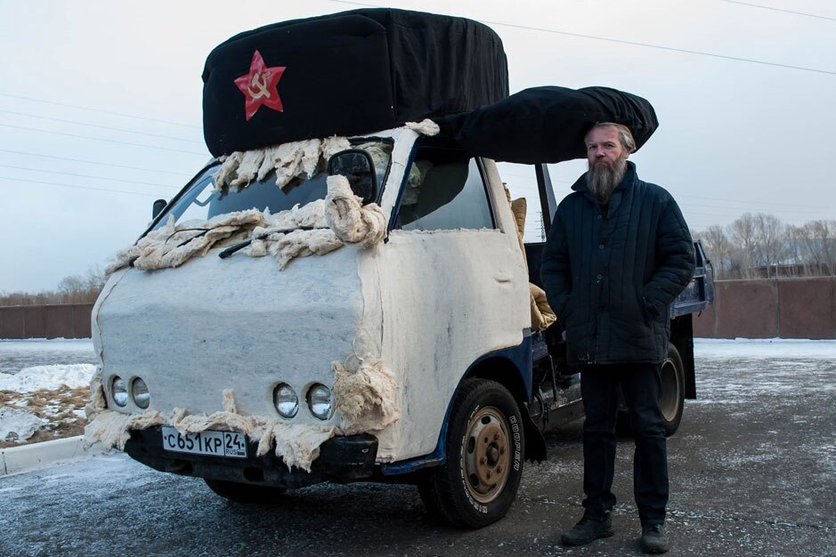 Vasily Slonov with “Vata-mobile”, one of his works from “Vatniks of the Apocalypse” series, 2015 / Photo: RFE/RL |