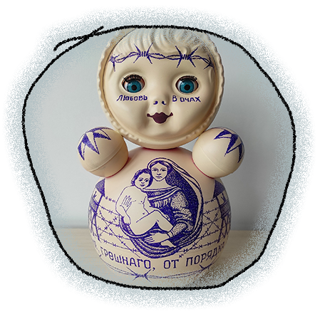 The court claimed the doll displays banned AUE symbols. Defiant, Slonov came to every court hearing with one of the dolls. After hearing the sentence he said: “I am not guilty and my conscience is clear. I justify my innocence as follows: I am an artist. I generate and create works of material culture. I research, artistically comprehend, and enrich the Russian cultural code, folk play and humor culture.”