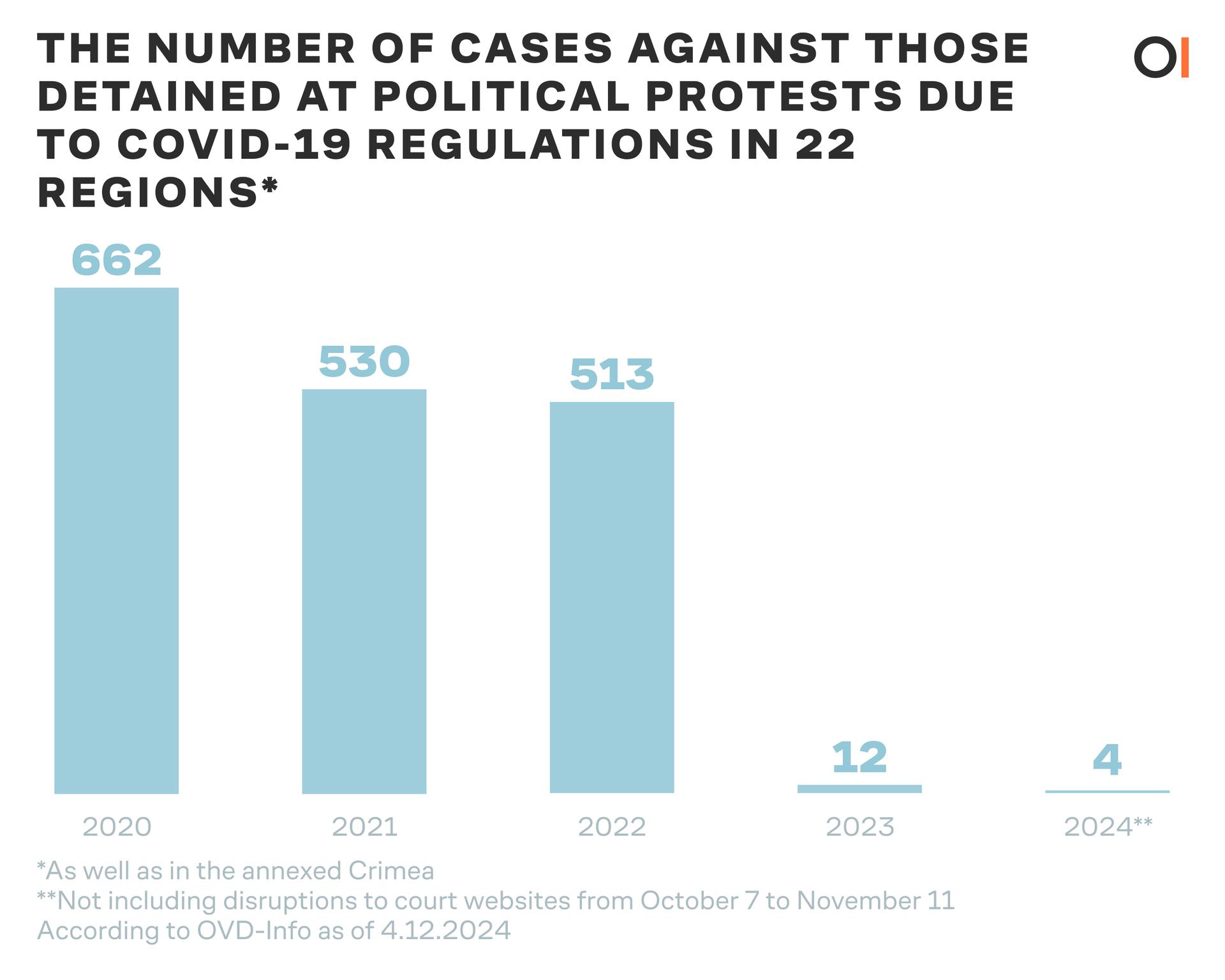 Furthermore, we have relaunched the OVD-Info Telegram channel dedicated to data, where we regularly publish key figures regarding political persecution in Russia. In one of our latest posts, we highlighted how the authorities continue to use COVID-19 restrictions, even four years after the peak of the pandemic, to exert pressure on participants in demonstrations and solitary pickets.