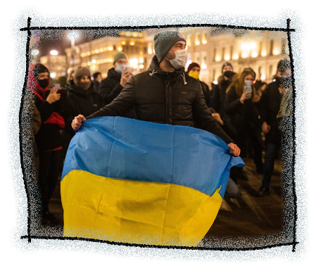 Man holding a Ukrainian flag at an anti-war protest in St. Petersburg on 24 February 2022, the first day of Putin’s full-scale invasion of Ukraine / Photo: David Frenkel, Mediazona |